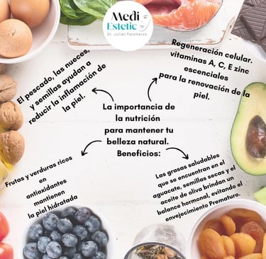 La nutrición es un pilar fundamental en la medicina estética y en la salud de la piel, ya que los alimentos que consumimos afectan directamente la apariencia, la hidratación y la capacidad de regeneración cutánea. A continuación, algunos puntos clave sobre por qué la alimentación resulta tan importante para el cuidado estético: